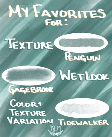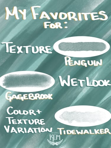 Tansy, Bridgewater, and Philosopher Falls should get honorable mention on my list, the texture these brushes provide is phenomenal. While I didn’t gravitate to them as much as the first three, they were there when I wanted to add more depth to my canvas. The brushes have irregular edges and slight color variations in their texture that provides a unique visual.